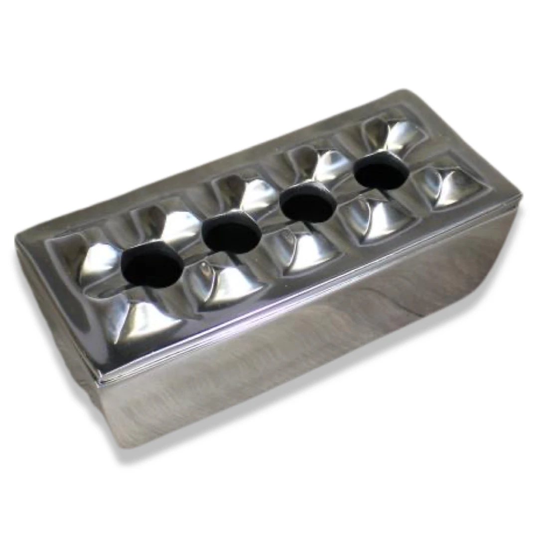 Introducing our handcrafted polished aluminium ashtray, a perfect addition to your indoor or outdoor smoking experience. This large round grid ashtray is designed with 4 holes and 6 notches, providing ample room for resting your cigars. Simply lay your favorite ring gauge stick on top and let the ash gracefully fall into the deep pewter tray below.