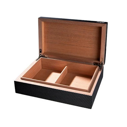 Humidor with high gloss carbon finish. Lined inside with cedar. Including an analogue hygrometer, a humidifier, and a portable divider.