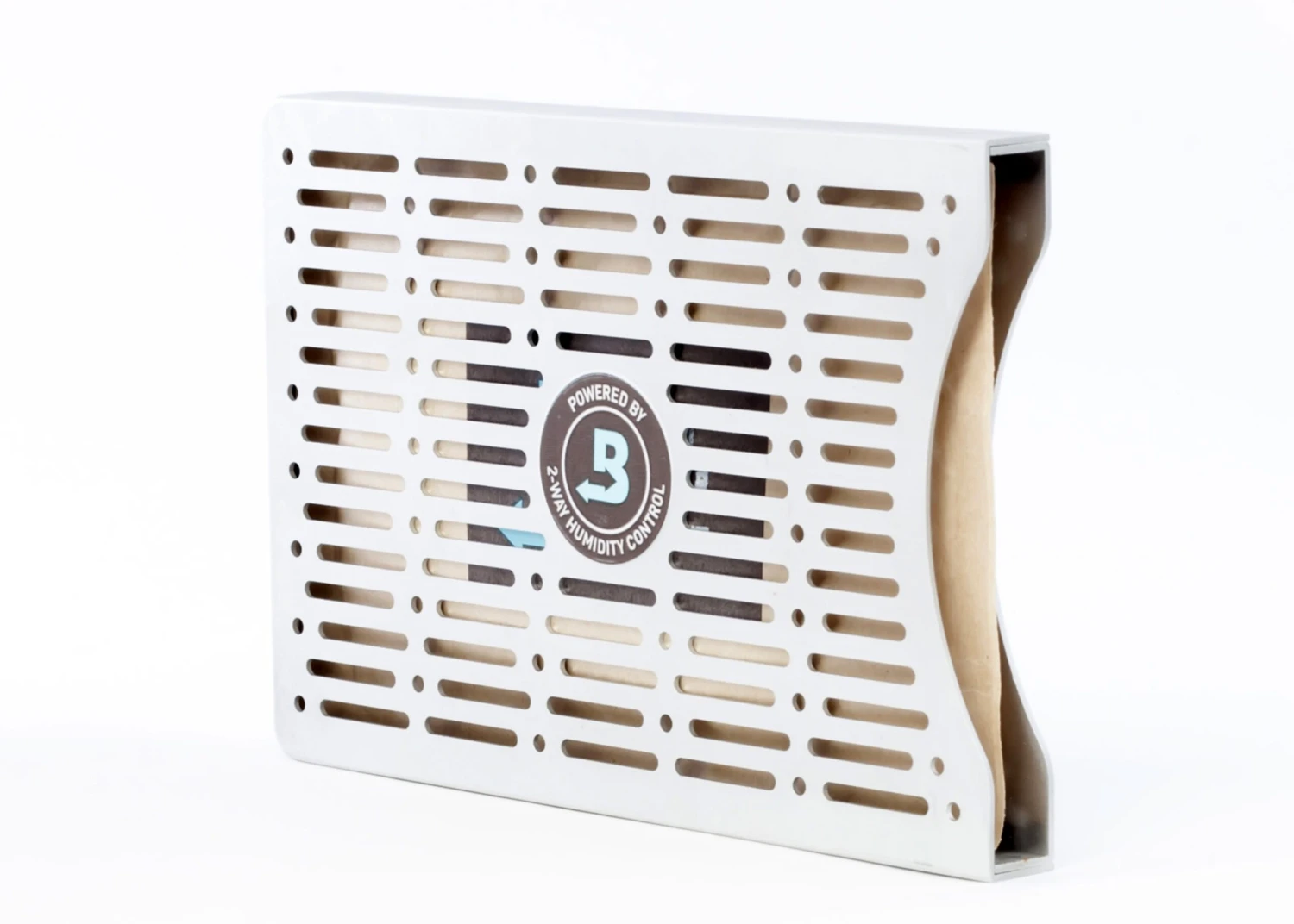 The Boveda metal pack holder comes in durable brushed aluminum with smooth rounded edges and has a slimmer profile than our cedar holder. Each metal holder holds one large Boveda pack.