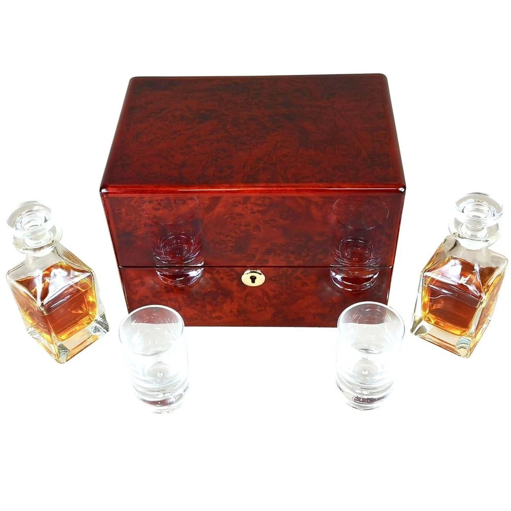 Hillwood Double Mini Decanter and Crystal Shot Glass Set in a Luxury English Burl Walnut Box.