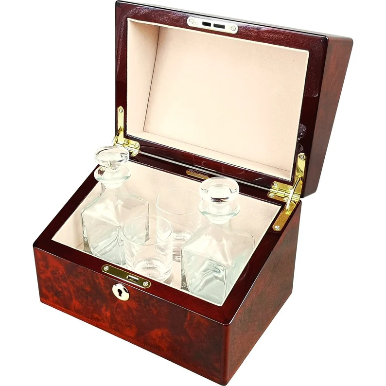 This boxed double mini whisky decanter set is made from the finest natural materials. The English Burl Walnut wood veneer case has 15 coats of gloss lacquer giving it a high gloss shine and is lined inside with soft simulated suede. A fitted key lock keeps it closed and secure. The luxury weight crystal shot glasses by Dartington are accompanied by quality glass square mini decanters to complete the set making a stunning centrepiece for the office or home of any whisky connoisseur. Perfect for a gift or personal use.