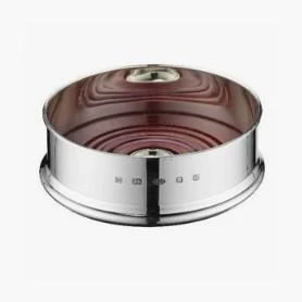 Hallmarked Sterling Silver bottle coaster with polished mahogany base and silver disc in the centre. Straight design 13cm diameter.