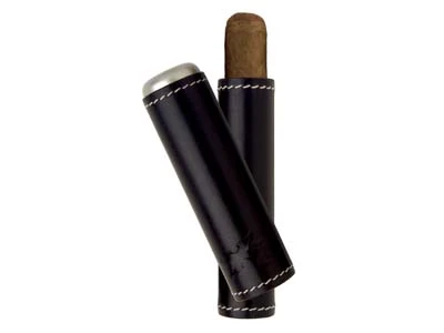 This telescoping case can up to a Churchill length cigar, up to 58 ring gauge. With top-grain, armada leather, each piece has a well-dressed appearance and a soft feel. Contrast stitching secures the leather, giving it a contemporary look. The inner lining of the crush-proof case, crafted with genuine Spanish cedar, holds the ambient humidity of the cigar and projects the fresh cedar smell of a humidor on every opening. Stylish metal caps cover each end, reinforcing the strength of the case. Black